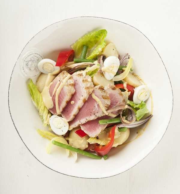 - Салат полейте горчичной заправкой, разложите по тарелкам. Обжаренное филе тунца порежьте тонкими ломтиками, разложите в тарелки с салатом и подавайте.