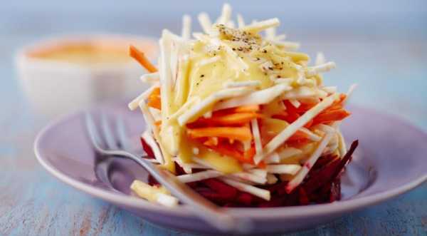 Вкусный, сочный, нарядный и очень простой в изготовлении салат. А главное — этот салат просто кладезь витаминов. И не стыдно подать к праздничному столу.