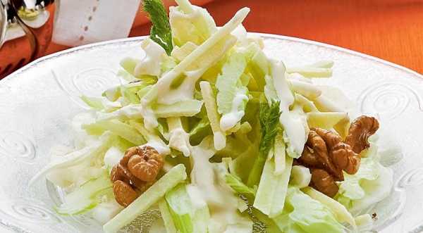 Почему то не часто встречающийся в наших широтах салат. А зря-вкусный и несложный. Считается, что был разработан шефом нью-йоркского отеля «Вальдорф Астория» и настолько полюбился , что его рецепт был распространен по всему миру. Вальдорф- это классно!